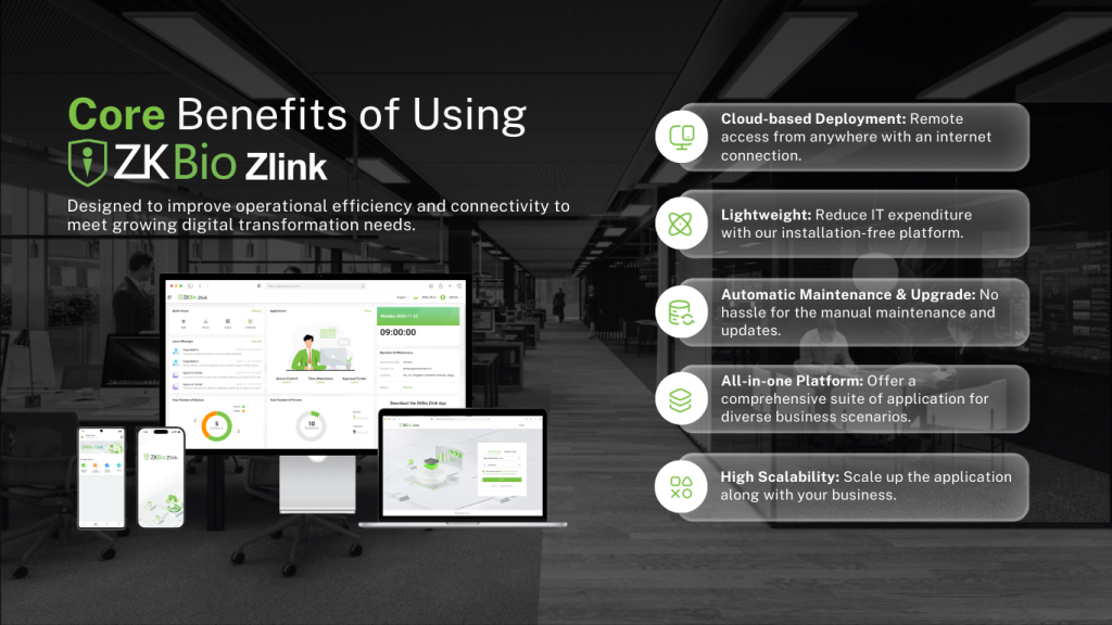 ZKBio Zlink by ZKTeco is built on the Minerva IoT platform to support digital transformation through improved efficiency and connectivity. Designed as a cloud-based IoT solution for SMBs, it simplifies operations by combining multiple application scenarios into a single, easy-to-manage platform. Hosted on a secure and scalable AWS cloud infrastructure, ZKBio Zlink removes the need for large upfront IT costs while offering flexible system expansion. With its smart and efficient design, ZKBio Zlink helps save time, reduce effort, and boost workplace productivity.