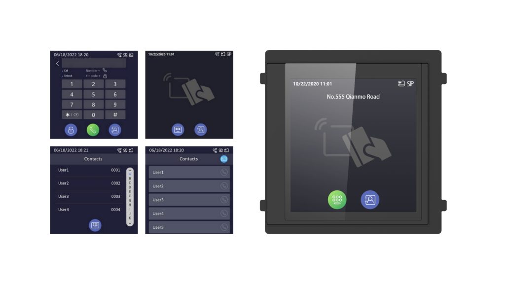 - DS-KD-TDE Touch Display Module with EM Card Reader: This practical touch screen module enhances access control and management functions.