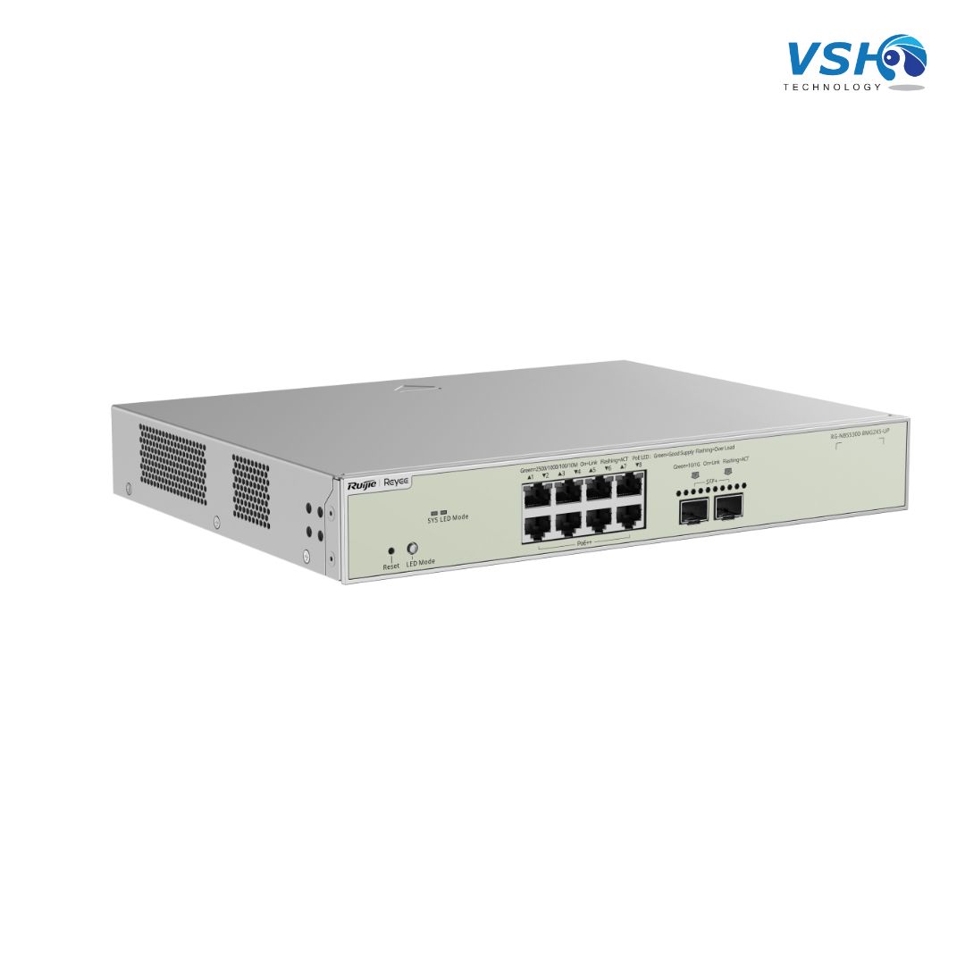 Moreover, it comes with PoE++ (Power over Ethernet Plus Plus) support, enabling it to power high-demand devices like Wi-Fi 6 access points and surveillance cameras directly through Ethernet cables. As a result, it simplifies installation and reduces infrastructure costs. In addition, the switch integrates intelligent management tools that allow IT teams to monitor and configure the network with ease. Overall, the RG-NBS5300-8MG2XS-UP empowers modern networks with speed, flexibility, and smart power distribution, making it a solid choice for future-ready IT environments.